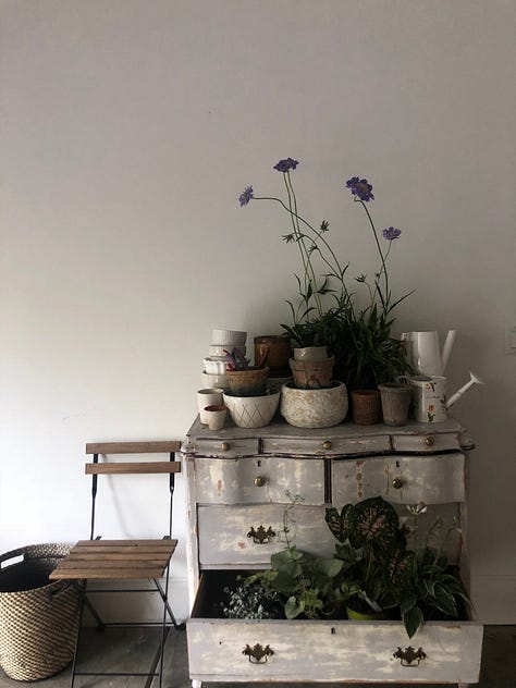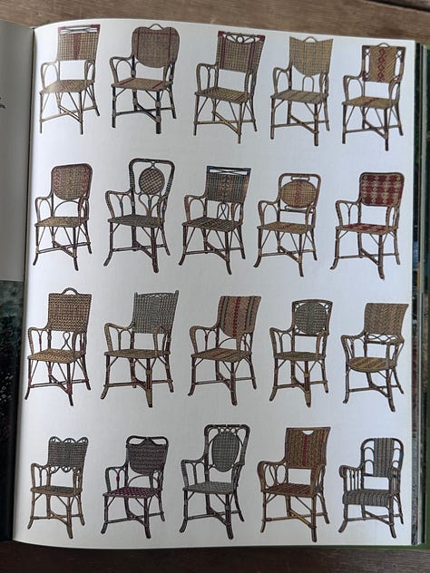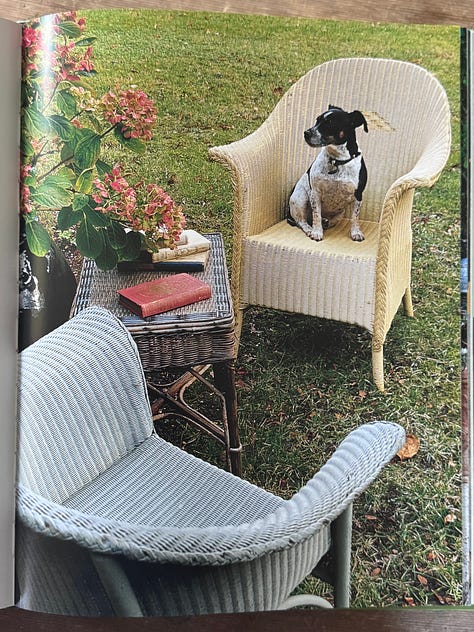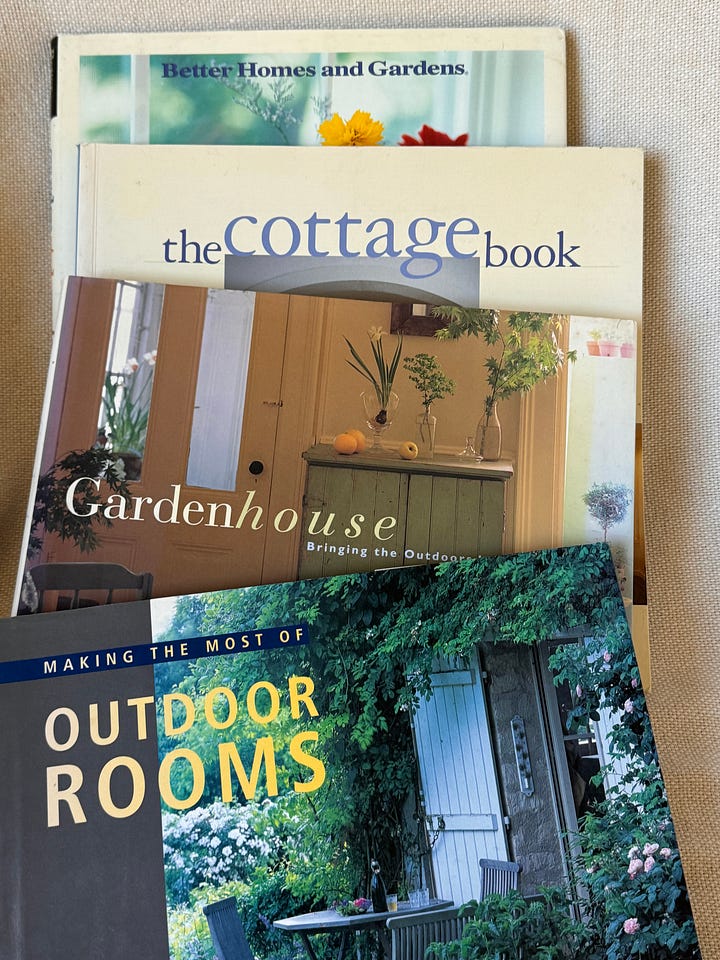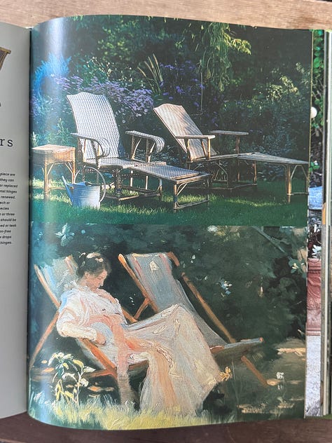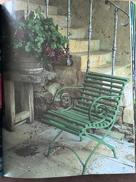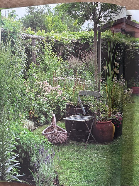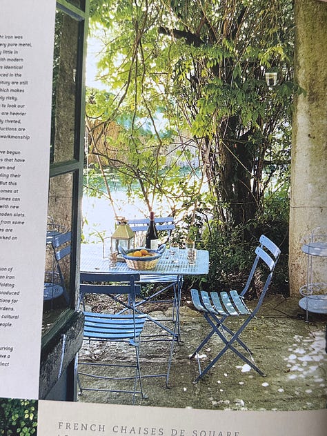 After looking through this book I was inspired to go on facebook marketplace to look for some furniture and search for: garden containers, sheds, planters, terracotta pots, metal planters, wrought iron furniture, wicker, bamboo and rattan furniture, Lloyd Loom, parasols, and hammocks.