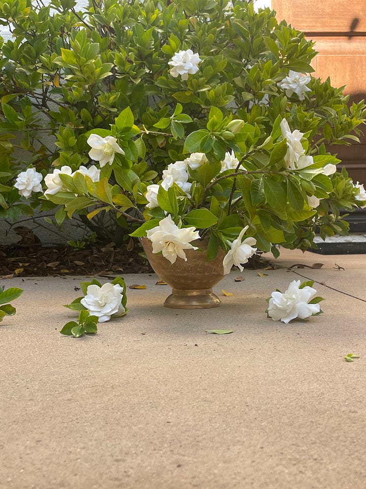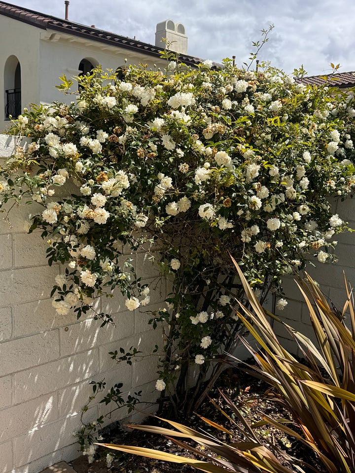 We have a small courtyard so common here in Southern California. I’ve planted lavender in the center, along with camellia bushes that bloom each autumn, two varieties of climbing jasmine, and a few evergreens in pots.