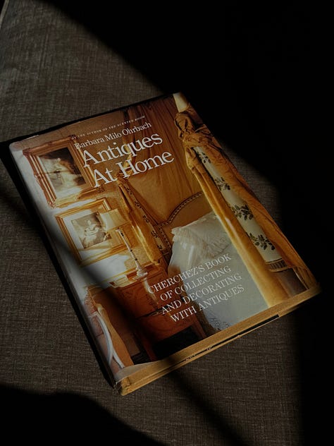 Because I source books, I’ve collected quite a few this month. On my coffee table which is always changing weekly. right now I have been flipping through Antiques at Home by Barbara Milo Ohrbach 1989 —a beautiful book that celebrates living with antiques in a warm and personal way. It reminds me that a home becomes meaningful through objects that carry stories.